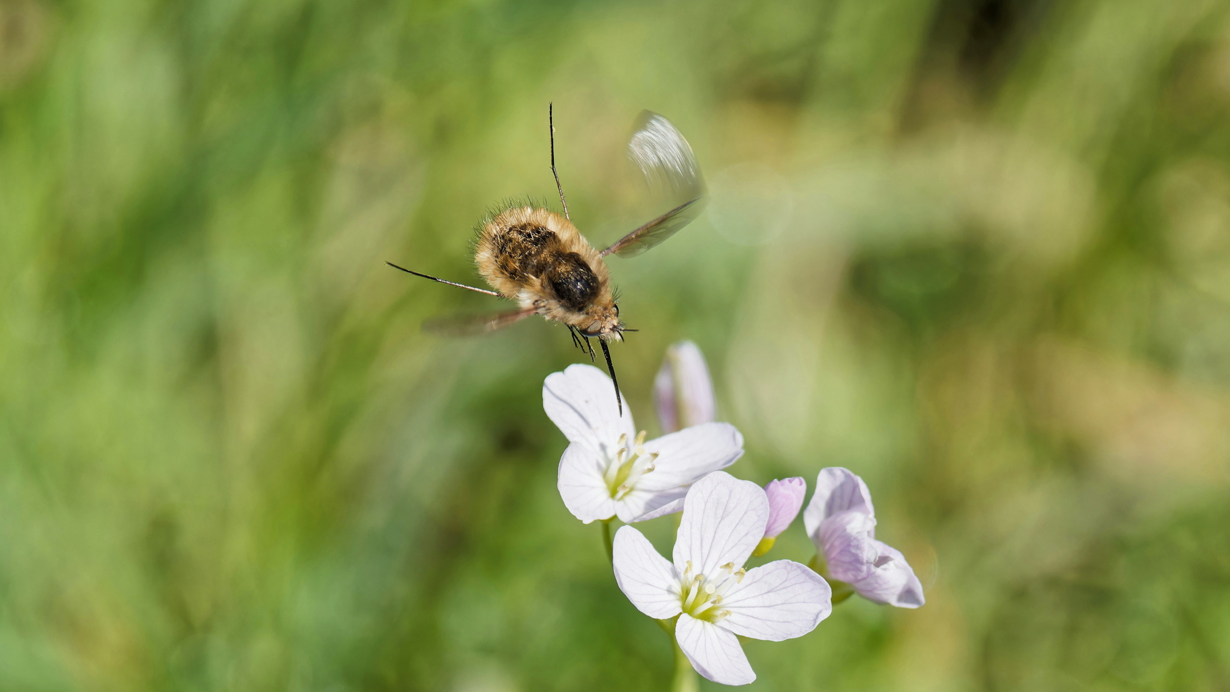 Wollschweber im Anflug auf Wiesenschaumkraut