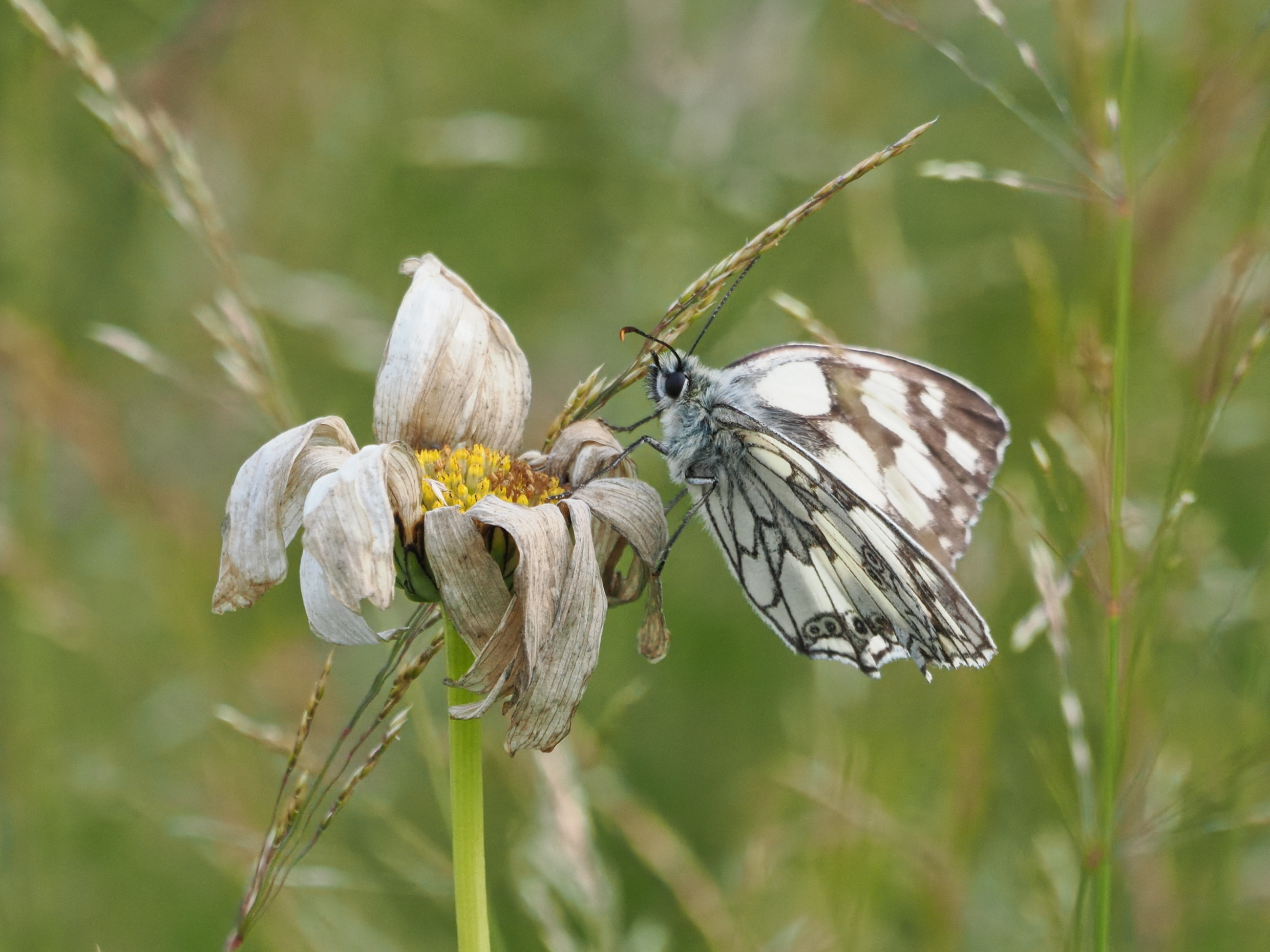 ...eines Schachbrettfalters in meinem Rasen -nein Wiese😁 Mitten in den Gräsern und den verblühten Margeriten. Ich finde, es muss nicht immer der super-duper aufgeräumte Hintergrund sein.
