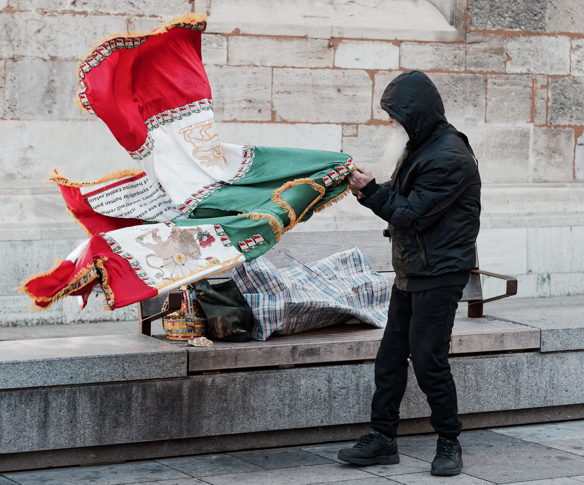 Wien, April 2024 am Stephansdom. Auf seinem Kostüm ist eine Strophe aus dem "Golestān" des persischen Dichters Saadi (1295) in mehreren Sprachen aufgedruckt. Gehört zu einer kleinen Serie.