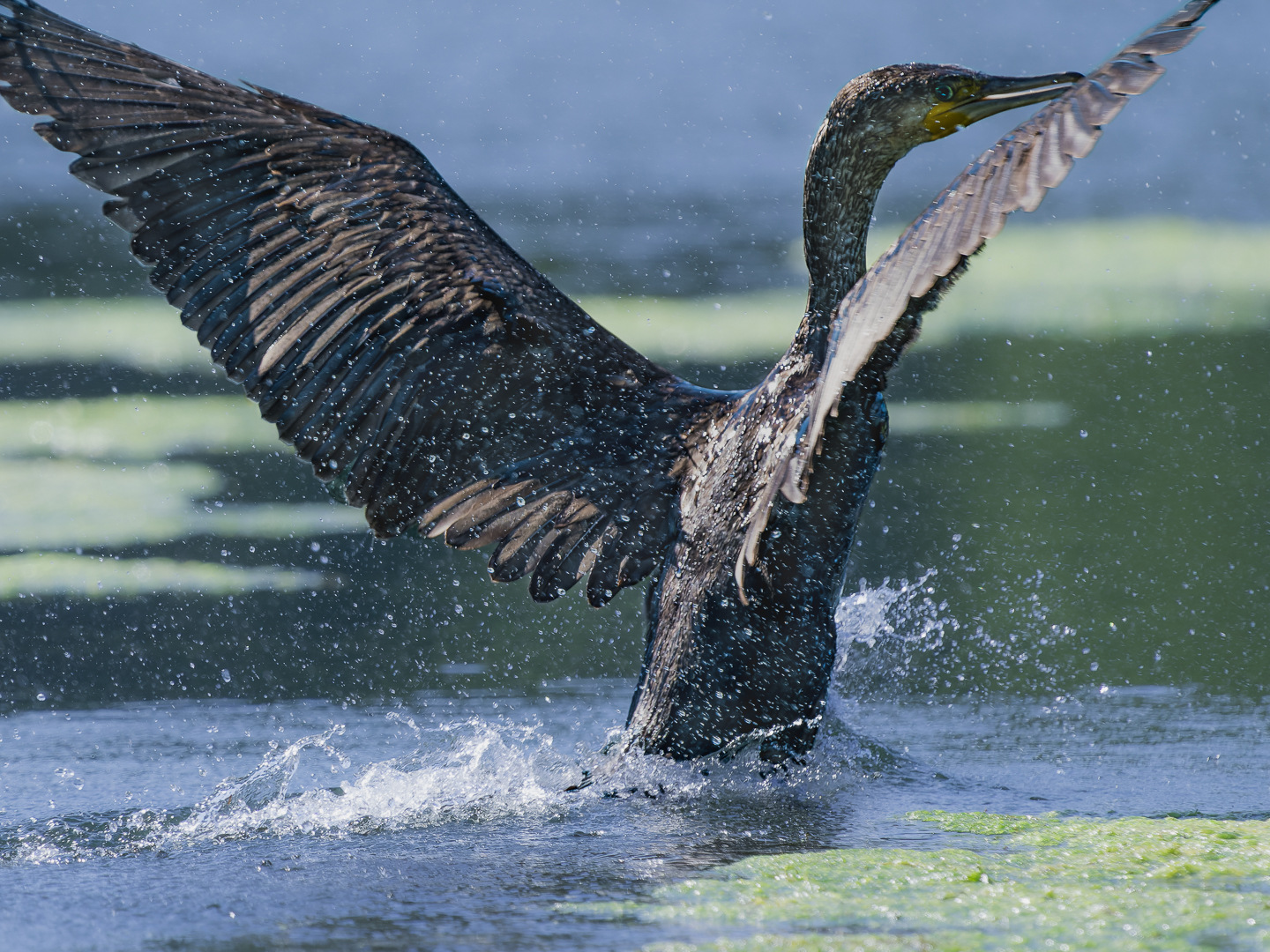 Kormoran nutzt bei sengender Hitze eine kleine freie Fläche in der Entengrütze, um auf dem Wasser "zu tanzen".. Unklar ist, ob es eine eigenwillige Jagdtechnik oder nur ein Badespaß ist ...