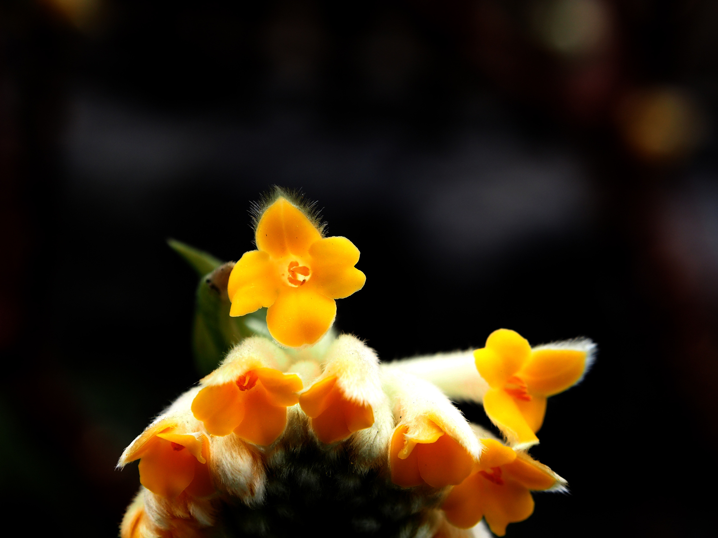 Japanischer Papierstrauch. Dieser legt schon im Herbst die Blütenknospen an, die jetzt zeitig im Frühjahr aufblühen. Aus der langfaserigen Rinde dieses Strauchs wird das feine, transparente Japanpapier handgeschöpft hergestellt.