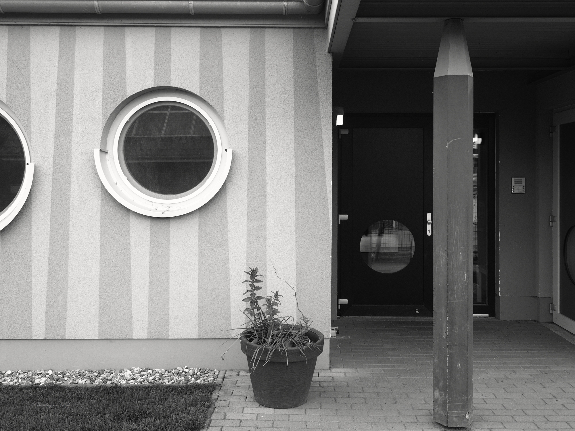 Nur 17 mm dabei und Fußzoom endete am Grundstückszaun. Ich habe versucht, die für mich bildwichtigen Motivteile dennoch abzulichten. Der Beton-Buntstiftfuß ist noch knapp vollständig drauf. In Farbe sah das Motiv nicht gut aus, da mir die Farbzusammenstellung nicht besonders gefallen hat.