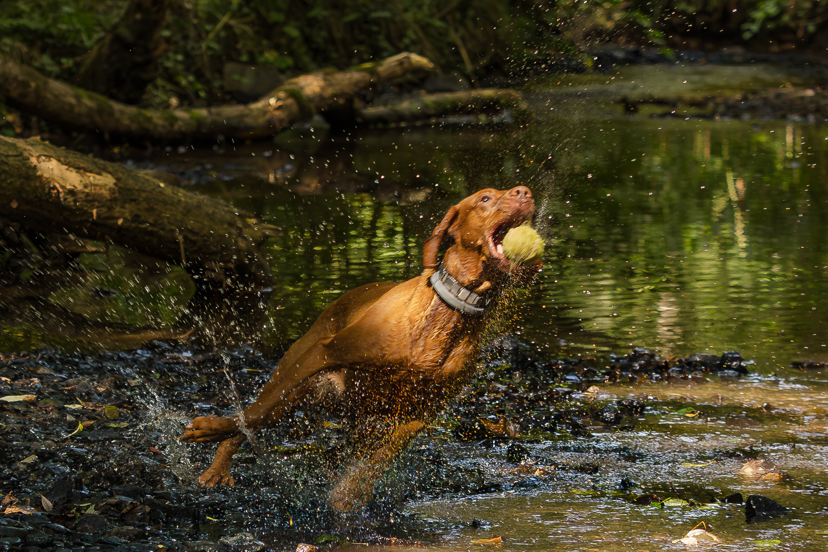 Für den Fotografen noch schwieriger als für den Hund: werfen, zielen, fotografieren - alles möglichst simultan in Person und ohne Hilfsmittel.