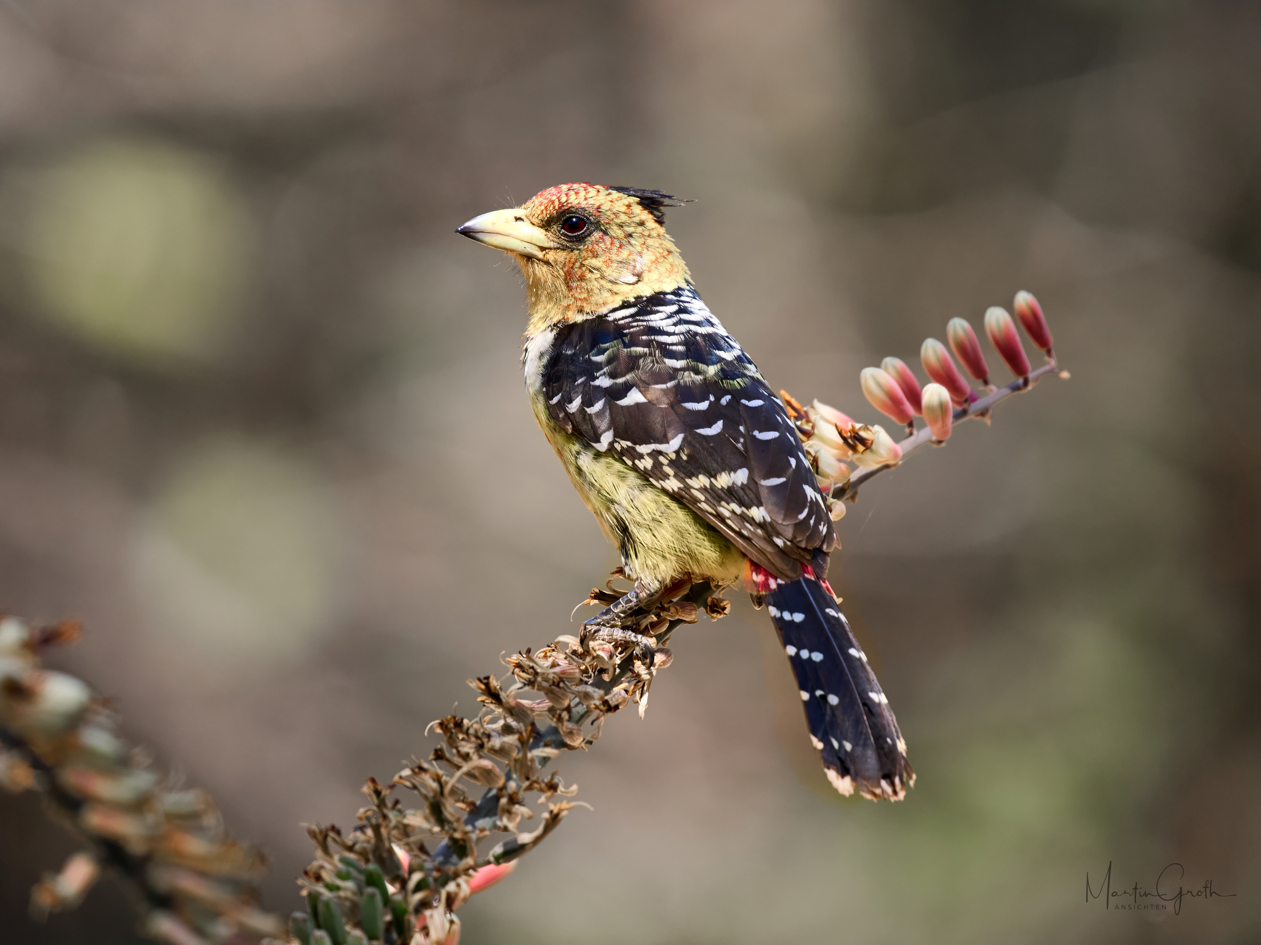 Ein "Crested barbet" oder auf deutsch "Hauben-Bartvogel", oder auch "Schwarzrücken-Bartvogel".