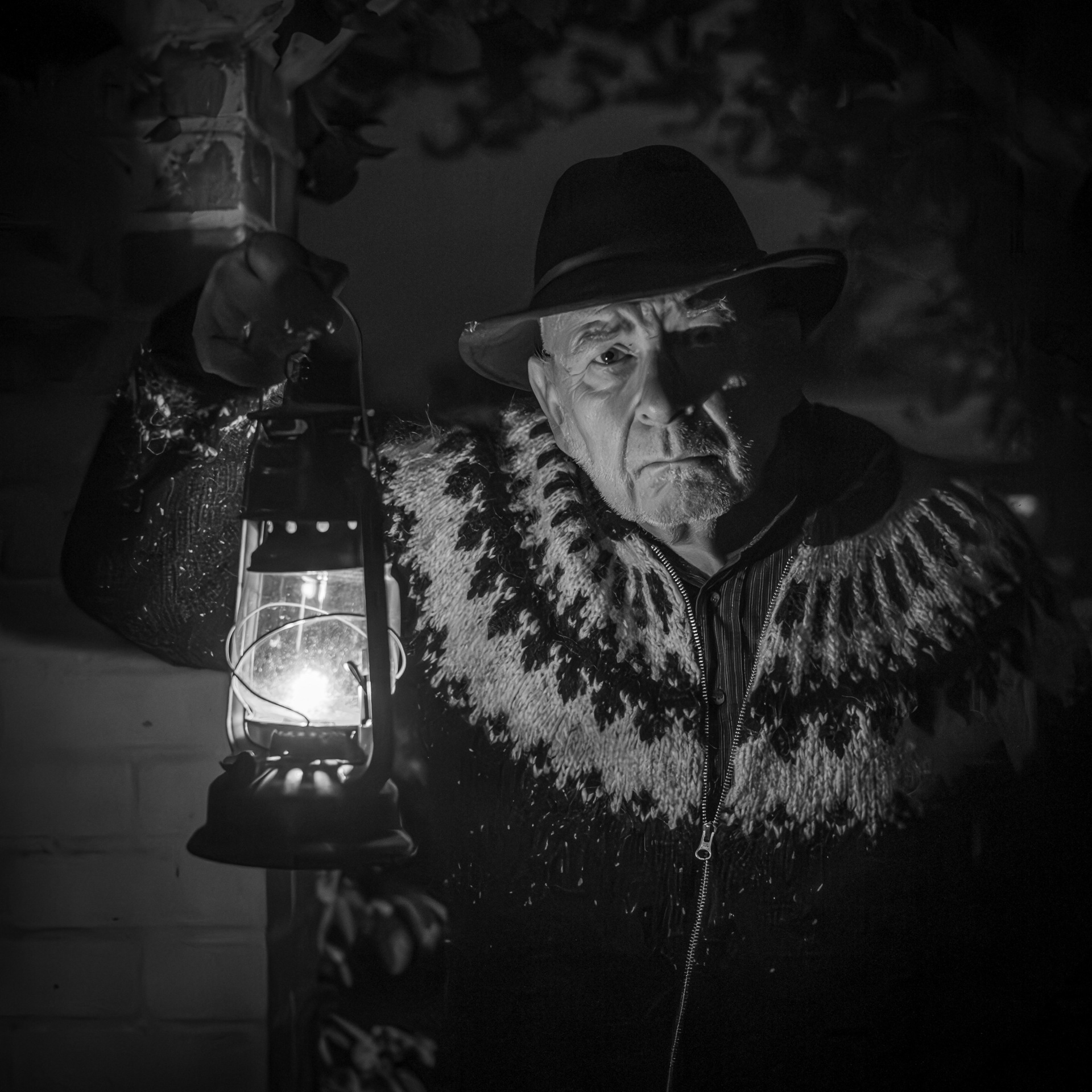...Versuch die Bildwirkung des "Film noir" zu erreichen der von krassen Hell-Dunkel Kontrasten lebte. E-M1X mit 25/1,2 auf Stativ. Auslösung per Hähnel Captur. Für die Beleuchtung Sturmlaterne mit Petroleumflamme. Hut und Strickjacke (hab keine mit Trachtenknöpfen) sollten ein wenig "Alp Öi-sieht-nach-den-Ziegen" Feeling vermitteln 😉 Bearbeitung aus dem Raw ausschließlich mit Lightroom Classic.