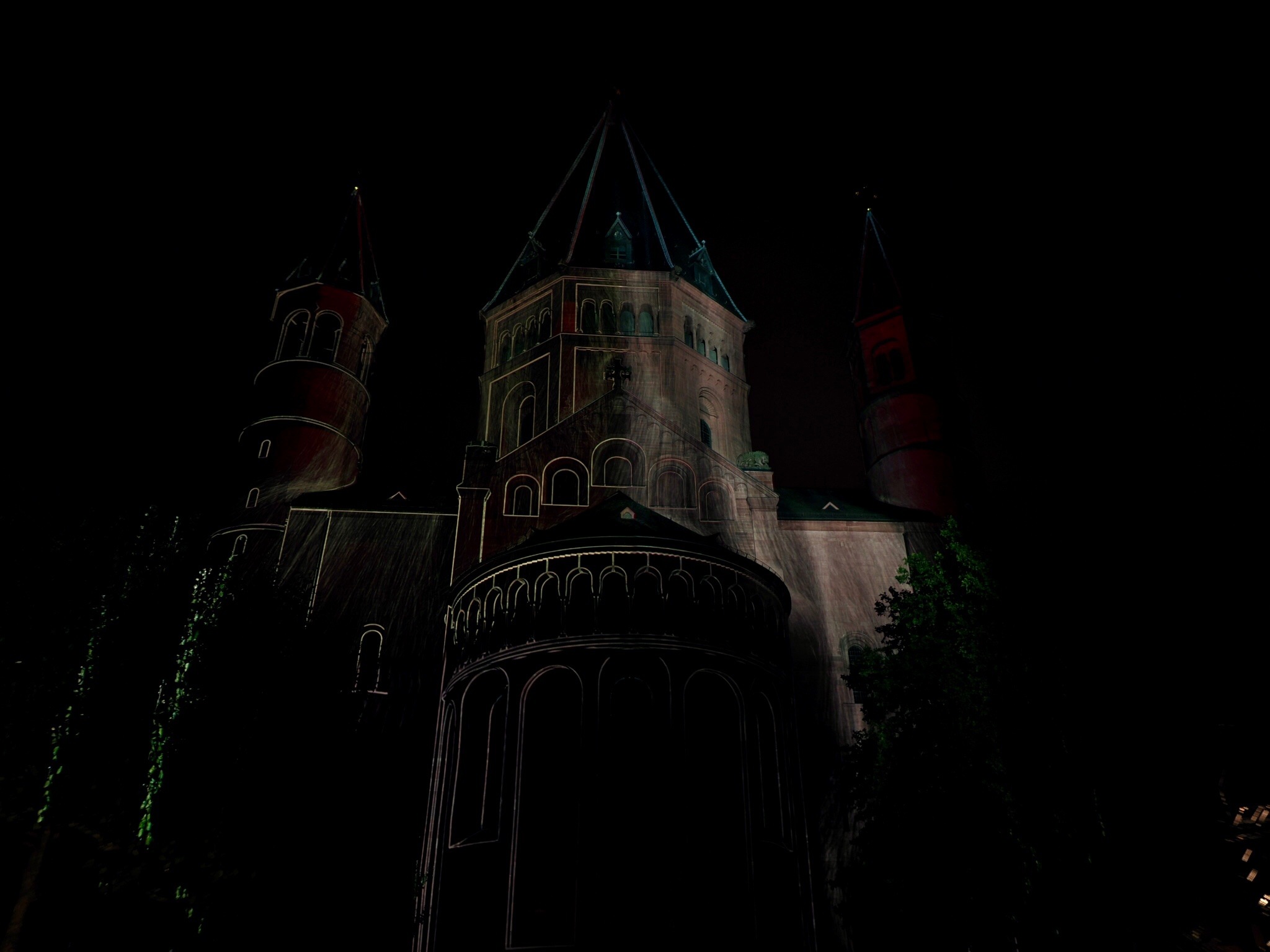...und das dunkle Rot, in das der Ostchor des Meenzer Doms bei der diesjährigen Projektion getaucht wird, läßt Geschichtskundige etwas schaudern.