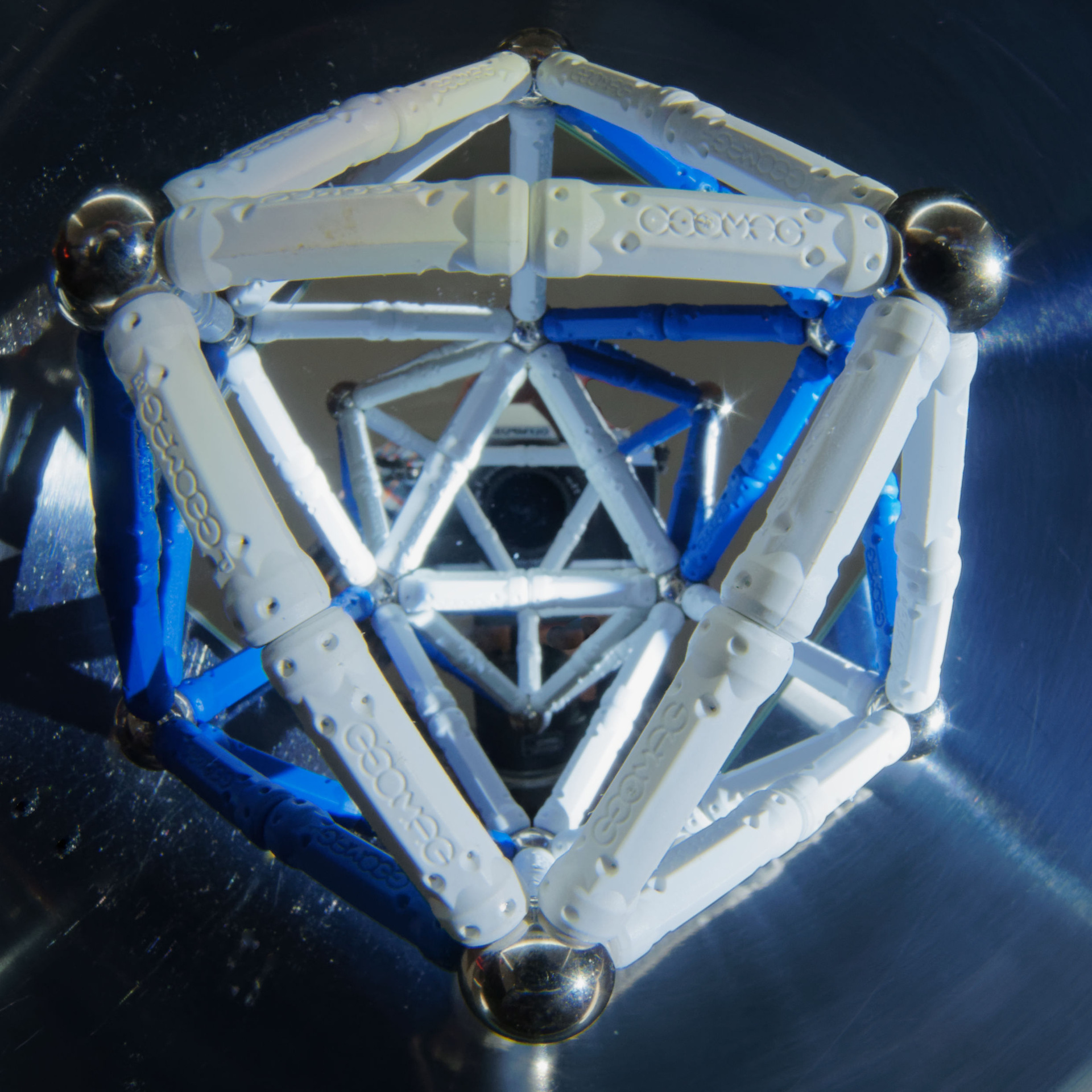 Der Ikosaeder steht auf einem Spiegel und in einer weiten Stahlschüssel.