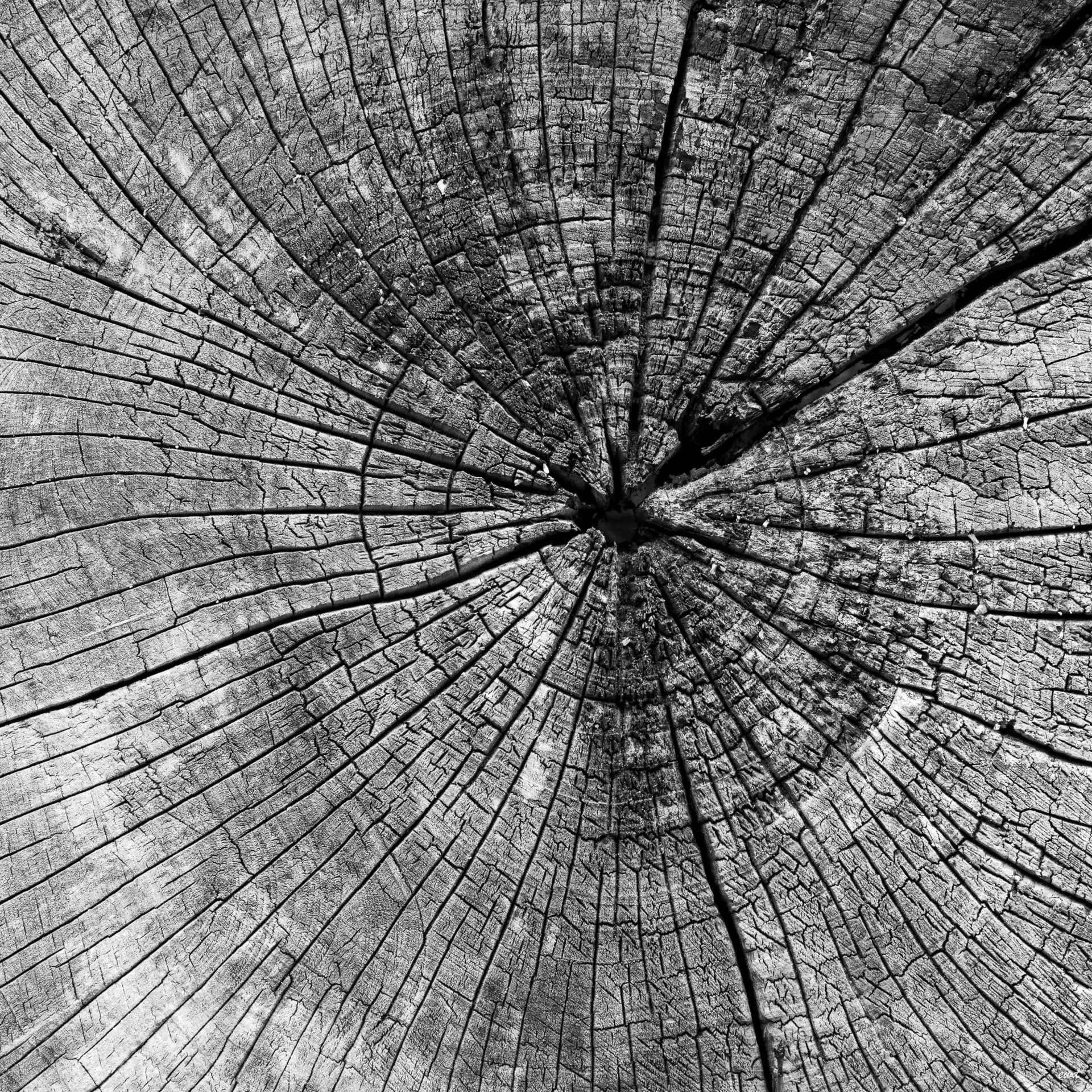 angewittertes Kopfende eines Holzstamms.