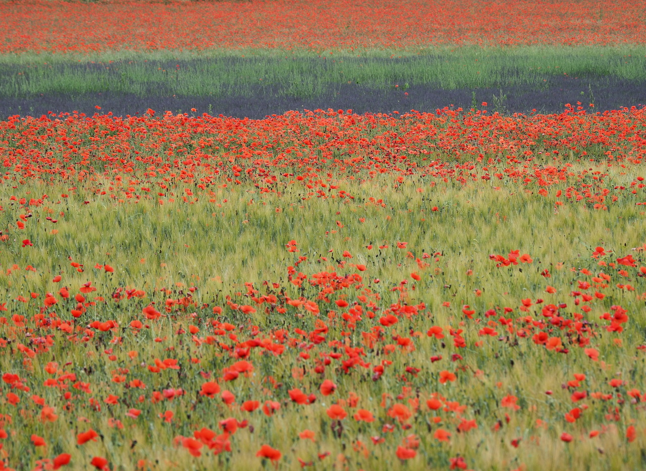 Ein Feld mit Lavendel inmitten eines noch größeren Feldes mit wildem Mohn und Getreide, umgeben von Wald (auf dem Foto nicht zu sehen) in der Provence, Juni 2018.