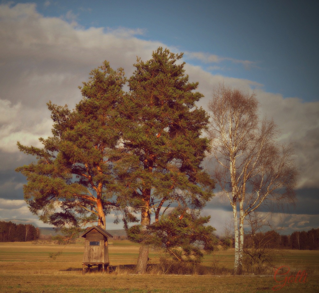Ich fuhr bei dieser Baumgruppe viele Jahre vorbei, habe gesehen wie die Bäume größer wurden und eines Tages stand da so ein "Hochstand" und ich wollte ein Bild einfangen, irgendwie kam aber immer wieder was dazwischen - einmal passte das Wetter nicht, ein andermal hatte ich keine Zeit ...... Doch eines Tages hat es gepasst und ich habe es einfangen können....
