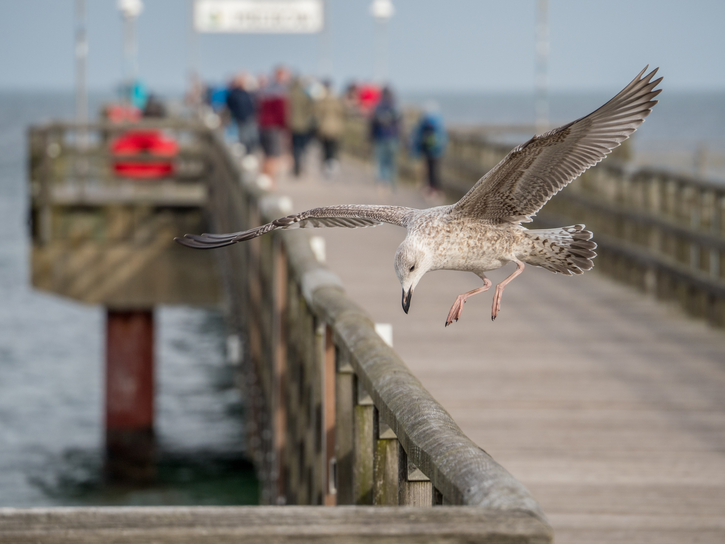 ... oder Seebrücke ist der Möwe hier völlig egal. Noch vor 8 Uhr waren schon reichlich Leute unterwegs in Prerow.