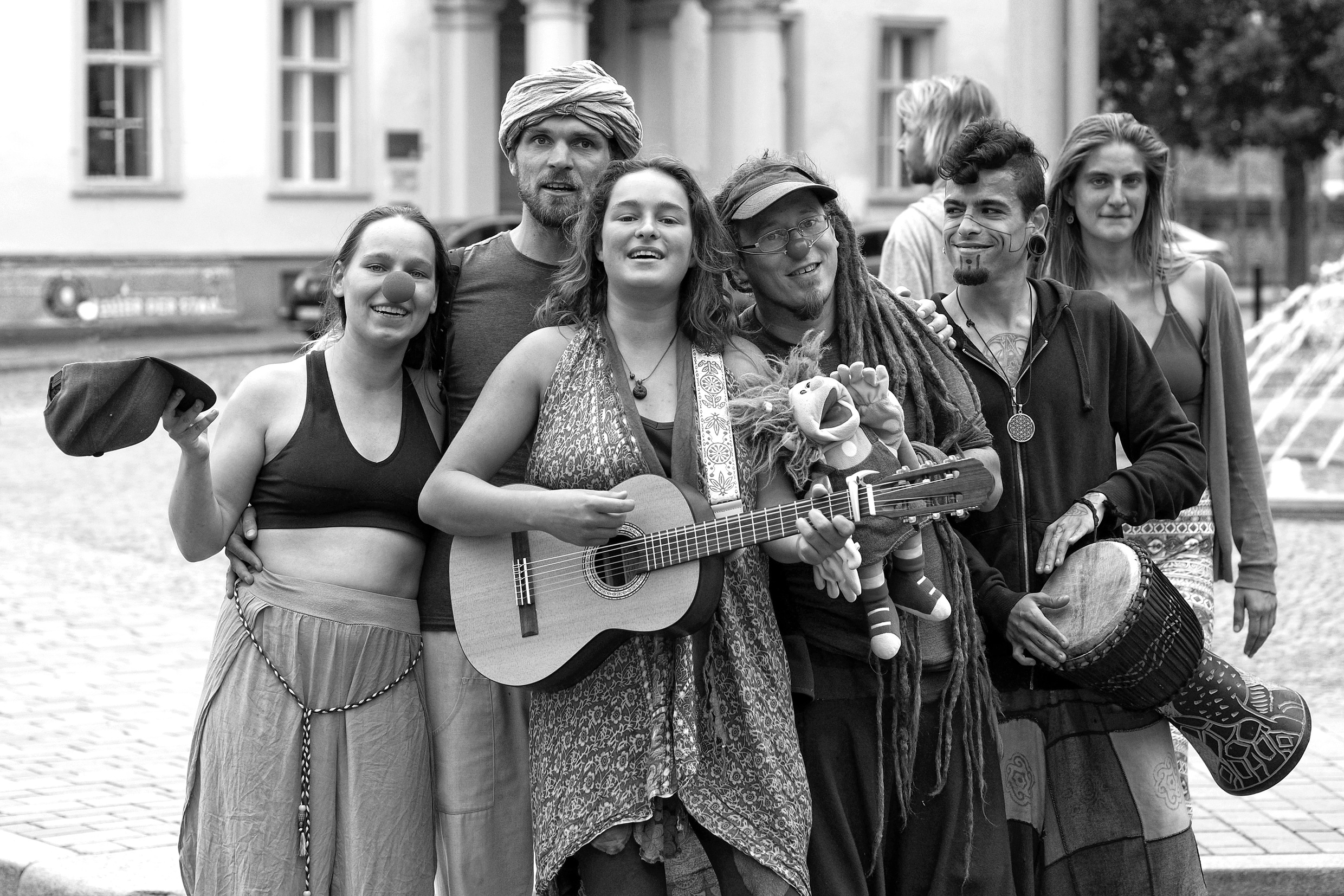 Auf Urlaubstour an der Ostseeküste: Lebensfrohe Straßenmusikerinnen und Straßenmusiker aus Berlin in Rostock. Darunter sind zwei mit "Nasenmaske" ;-)
