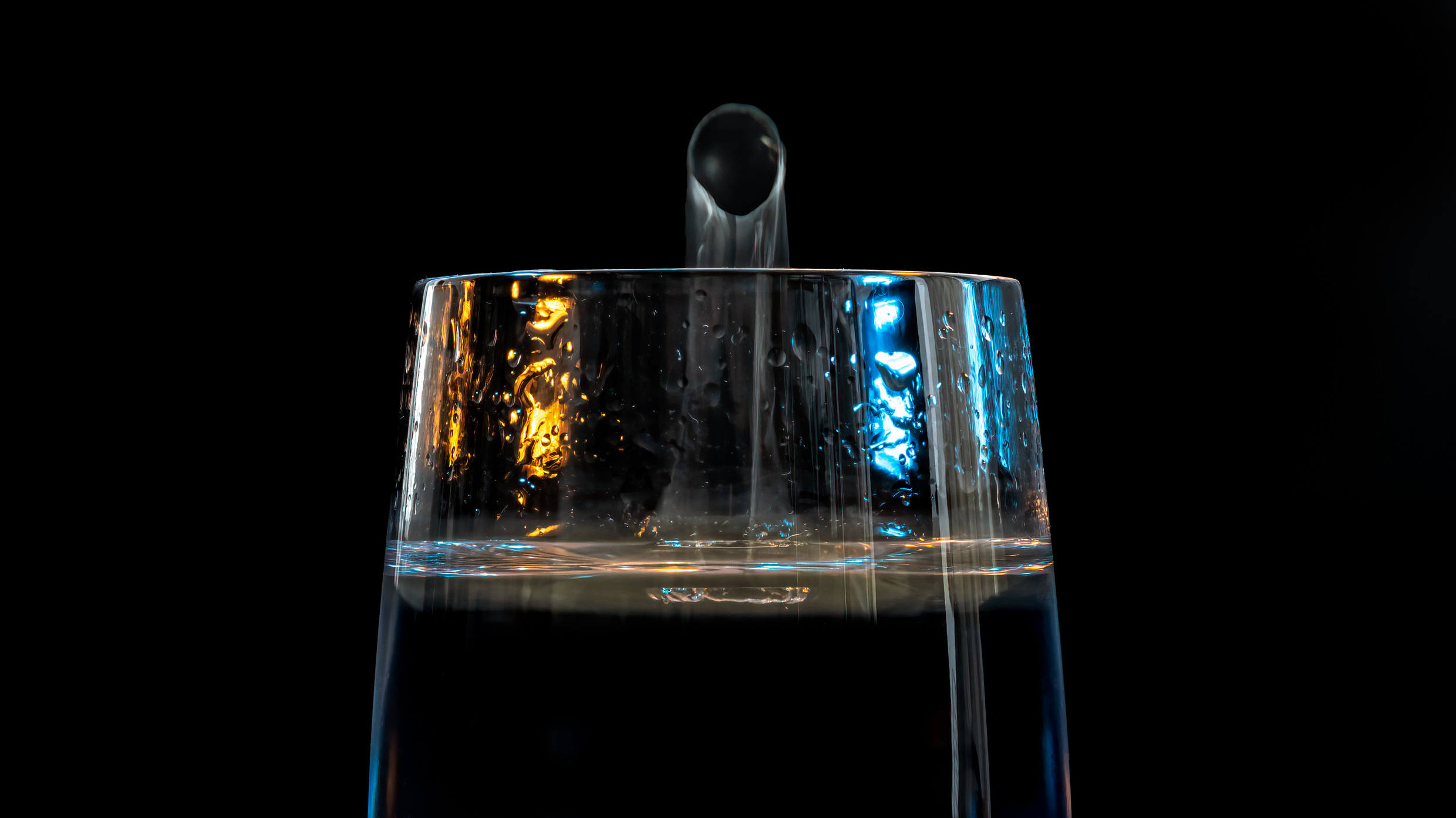 Es ist wieder ist ein sehr sonderbares Foto bei meiner Tropfenfotografie entstanden. Der Tropfen der beim Eintauchen ins Glas wieder zurückschießt, wird nicht angeleuchtet, jedoch seine Umrisse und der feine Wassernebel, den er mit in die Höhe reißt. Mehr hier.