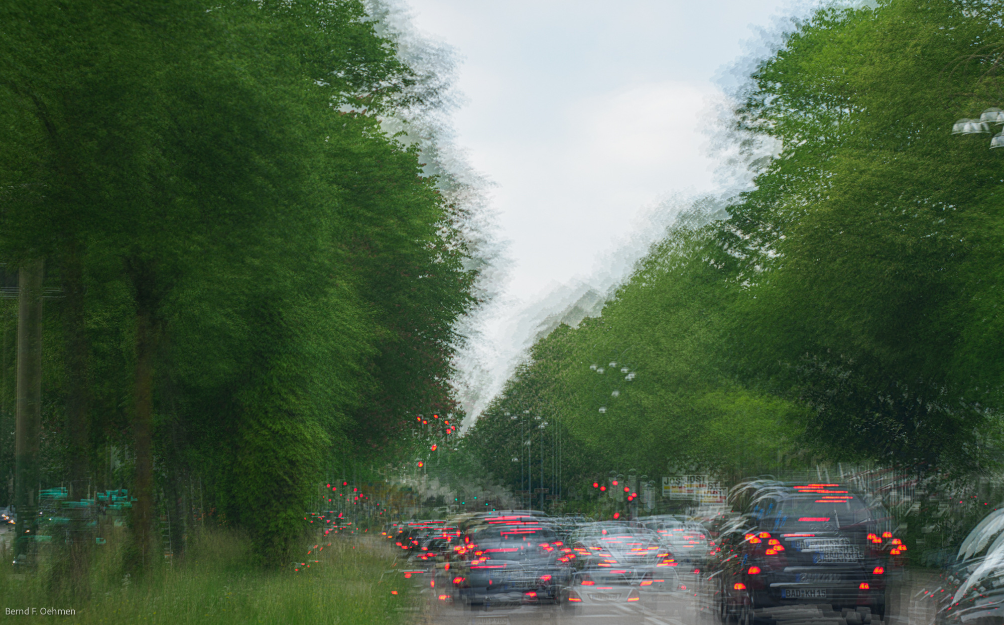 Hohes Verkehrsaufkommen, aus fahrendem Auto. Kamera vor Windschutzscheibe montiert.