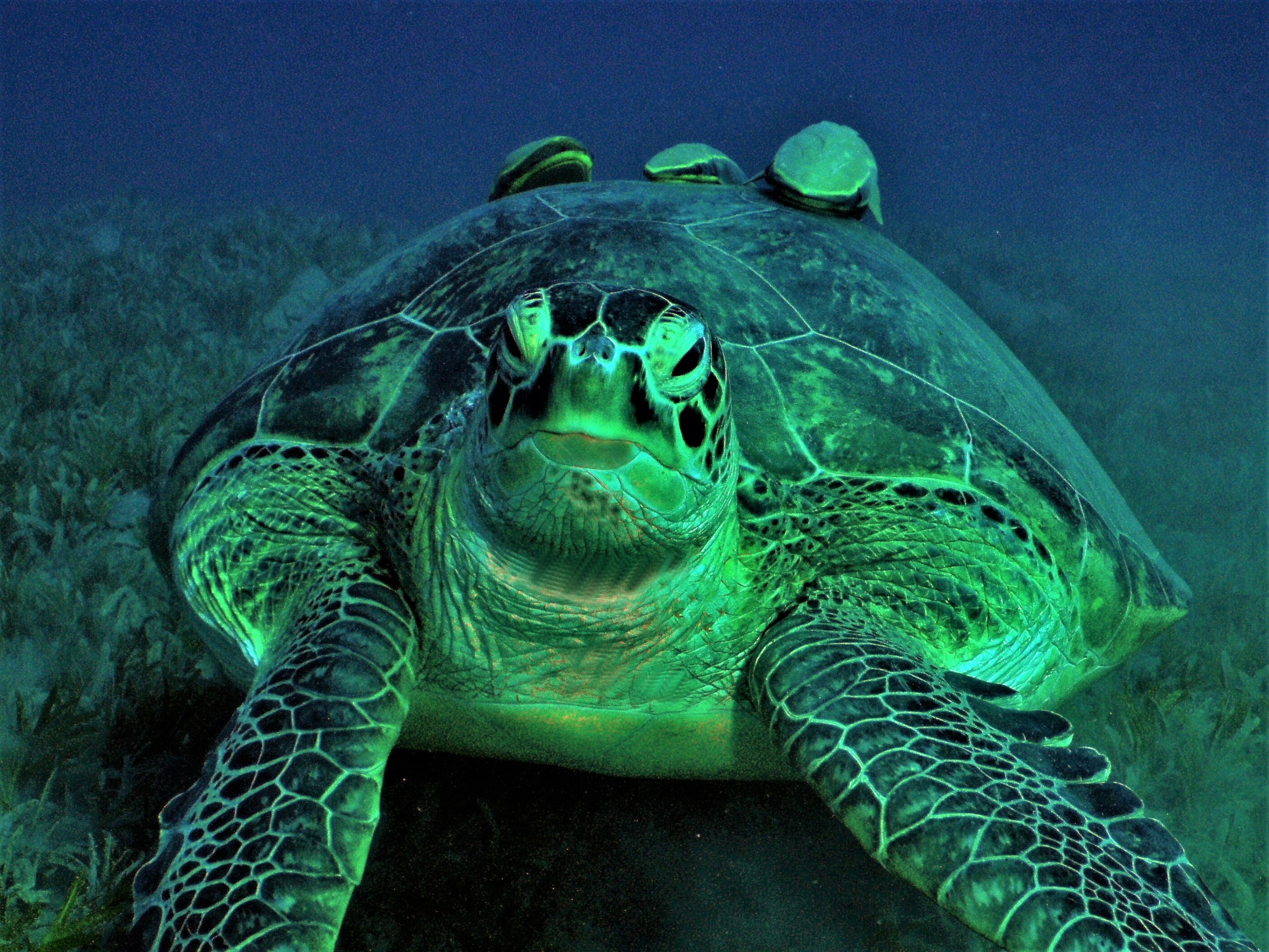 steinalt und richtig groß. Man findet diese Tiere oft auch Seegraswiesen beim Fressen. Nähert man sich mit Bedacht, lassen sie einen ganz nah an sich ran. Dieses Exemplar hat drei ständige Begleiter, sogenannte Schiffshalter...