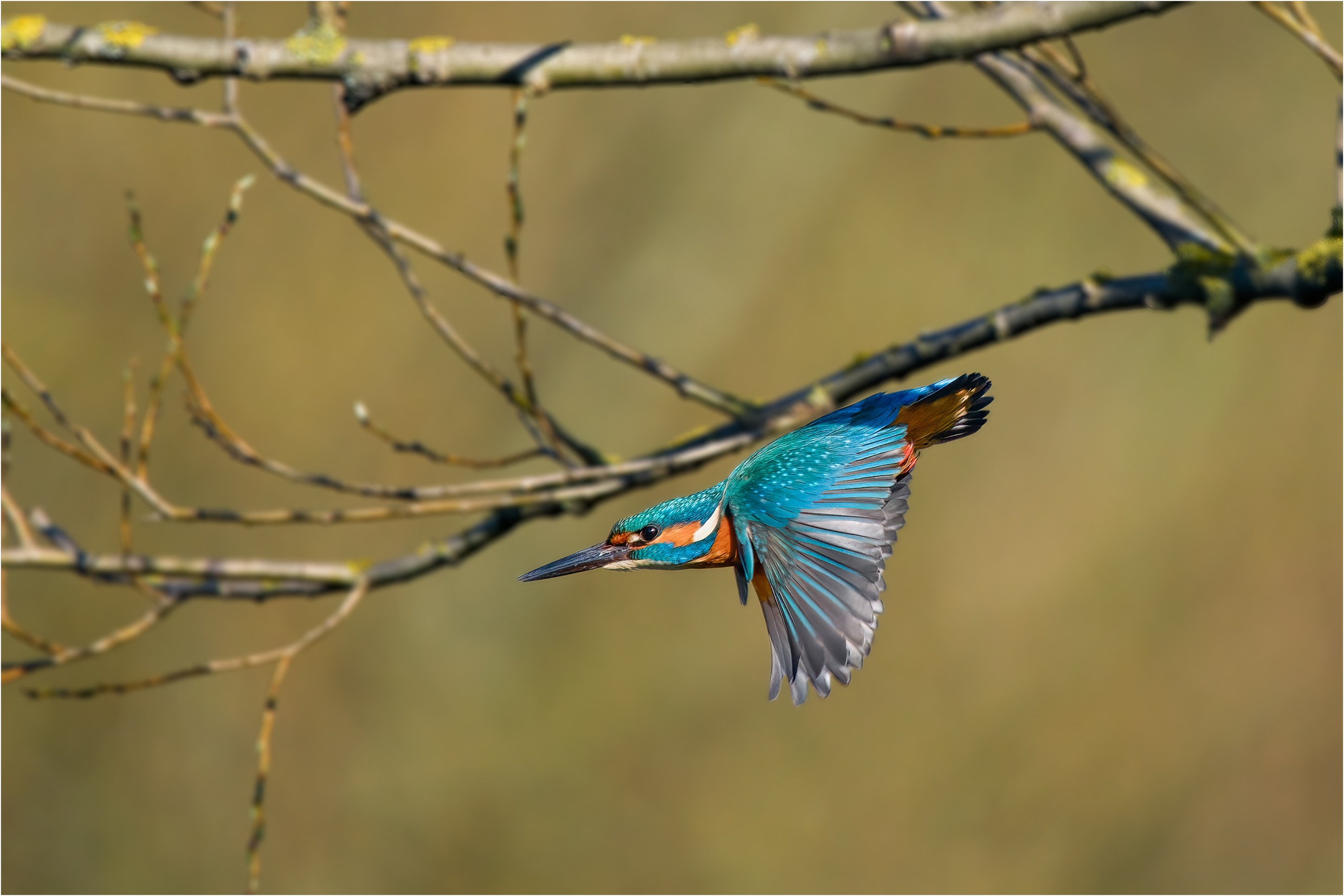 Wer, wie ich, keine Bruthöhle kennt, wartet länger... Hier hatte ich innerhalb von 3 Stunden den Eisvogelmann einmal in Fotodistanz. Dank ProCap konnte ich den Abflug auch halbwegs erträglich einfangen. Wäre so auch mit der MII oder 1X gegangen, da leider die Vogelerkennung der OM-1 Äste vor dem Vogel 100% spannender findet, so auch hier. Der typische Eisvogel setzt sich ja gerne ins Geäst, hier verdeckte ihn ein kleiner Ast teilweise, weshalb ProCap den Absprung leider nicht scharf erfasst hat. Ein und zwei halbwegs scharfe Bilder sind dennoch entstanden, als der Vogel durch die Schärfeebene flog, da ProCap auch in der SH2 Einstellung so schnell fliegende Vögel im CAF-TR nicht hinterherkommt (ist wahrscheinlich auch nicht realistisch, das zu erwarten). Ich hoffe sehr, dass irgendwann die Vogelerkennung das "Astproblem" los wird, denn was die OM-1 definitiv besser kann, ist, wenn sie den Vogel richtig erkennt, bleibt sie auch ziemlich gut drauf, darf halt kein Ast im Weg sein, das kann die X1 und MII so nicht.