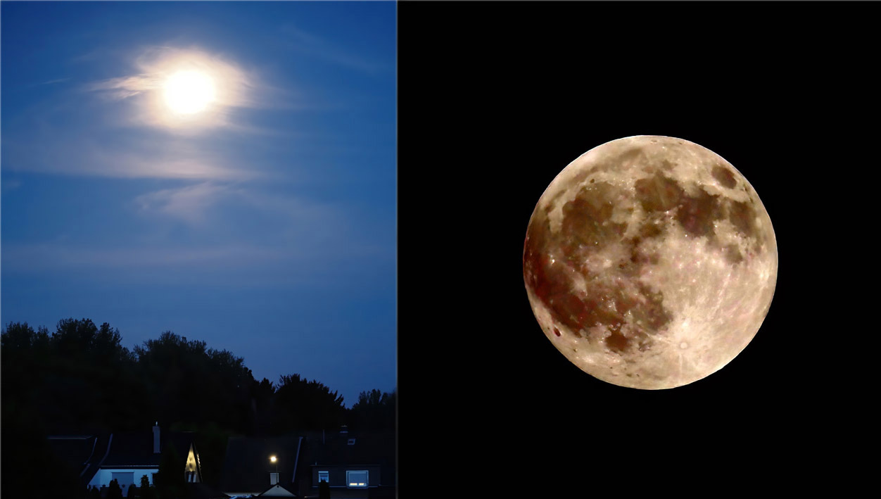 ... bei Vollmond die Mondfinsternis oder gar den Blutmond zu erwischen, scheiterten an widrigen Umständen und an meinem Schlafbedürfnis (wird oft unterschätzt). Linkes Foto mit dem 75/1.8 um 22:00h, rechtes Foto mit dem 40-150/2.8Pro + MC14 um 23:30h - alle EM5iii