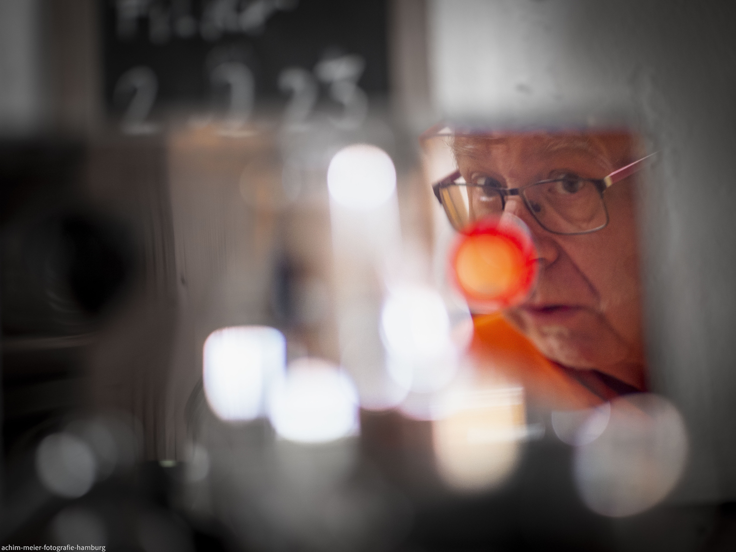 ...trage ich normalerweise nicht. Aber hier fiel es meiner Espressomaschine ein nachzuheizen just als ich mich abmühte mein Spiegelbild einzufangen ohne dass sich die Kamera auch im Chromglanz der Maschine spiegelt. Auch hier bin ich mir bewusst, dass das kein "normales" Portrait ist (davon habe ich in meinem Leben so viele gemacht, dass es für mehrere Fotografenleben ausreicht) aber mir gefällt hier die Situationskomik und das unscharfe Ambiente drumherum incl. Einsatzdatum der Entkalkungspatrone...