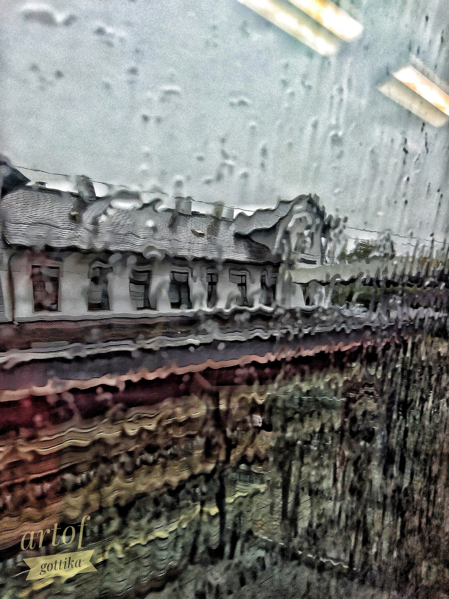 Am Bahnhof, aus dem Waggon durch die Scheibe das Bahnhofsgebäude als Nassbild eingefangen.