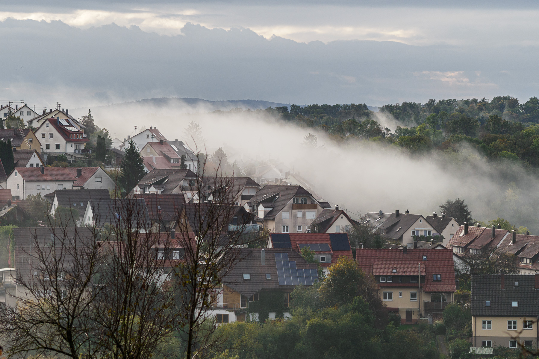 Eigentlich war ich wegen den Herbstfarben unterwegs und auf dem Weg in die Landschaft sah ich die "Wolke" über die Häuser. Schnell das 75/1,8 an die Kamera und dann ein Bild gemacht.