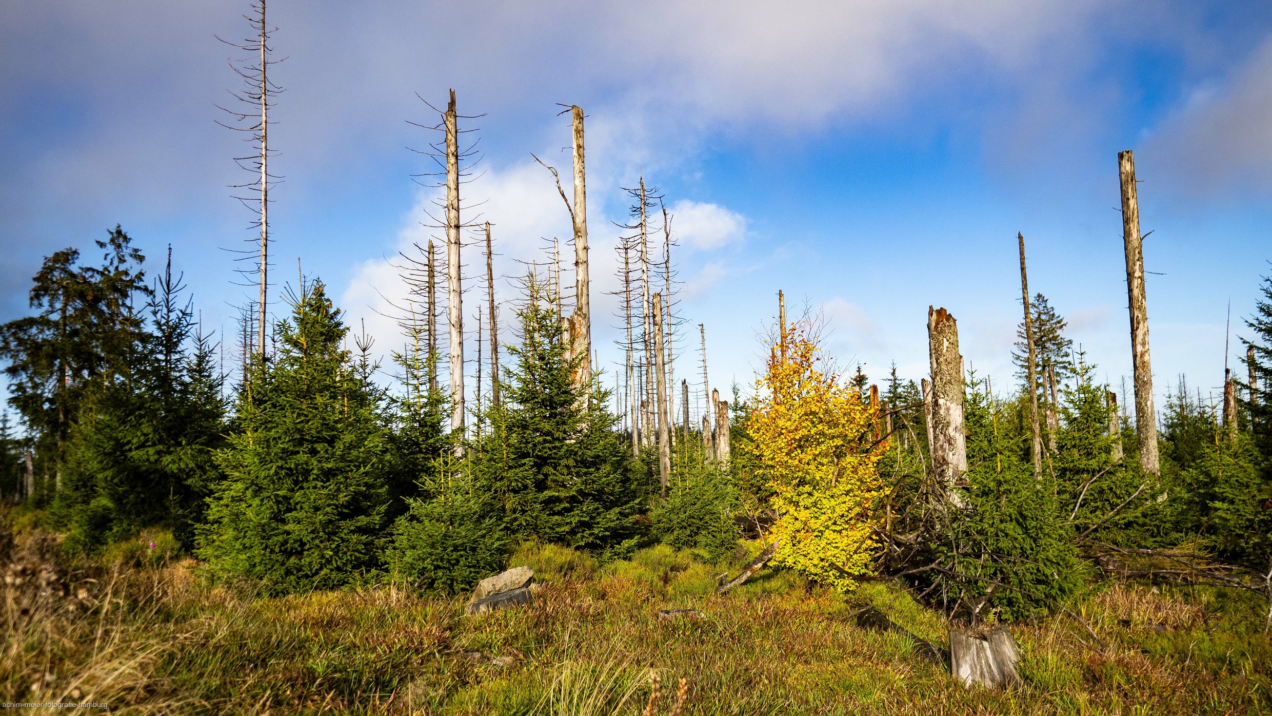 ...der Fichten-Monokultur ist hier im Nationalpark Harz gut erkennbar. Die abgestorbenen Fichten verrotten und bleiben im Wald und von unten kommt der Nachwuchs. Die Fichtenskelette zu sehen ist auch für mich sehr gewöhnungsbedürftig, aber ich denke der Weg der hier eingeschlagen wurde ist der richtige und in wenigen Jahrzehnten wird der Harz wieder langsam als Mischwald zu erkennen sein...