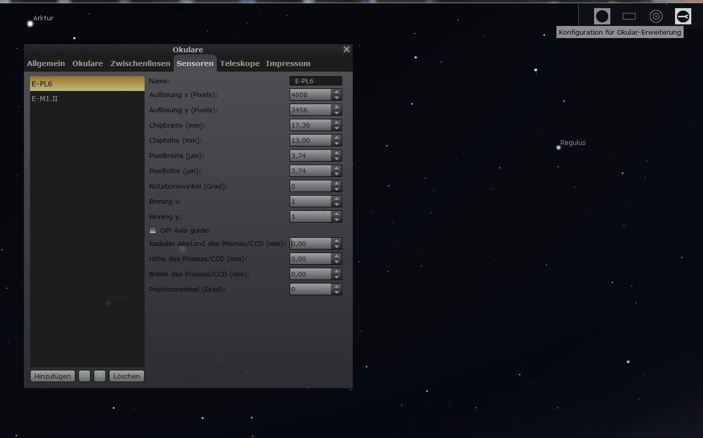 In der Freeware Stellarium kann man wunderbar sein Bildfeld (FoV -field of view) planen: Links oben beim Schlüsselsymbol geht dieses Hilfsfenster auf: Da gibt man seinen Kamerasensoren ein, wobei die Größe des Sensors ist ja fix ist: 17.3 x 13 mm Für die FT Kameras mit 20 MPixel Sensor (ab E-M1.II, OM-1, OM-5 und PenF) ist die Auflösung: 5184x3888 und die Pixelgröße 3,3µ. Für die mFT Sensoren mit 16 MPixel Sensor (E-PL6/7, E-M1, E-M10.II und E-M5) sind es: 4608 x 3456, die Pixelgröße ist da 3,74µ Bei Teleskope gibt man die Linsen / Fernrohrwerte ein: Also einfach Brennweite und Objektivdurchmesser (spielt aber nur eine Rolle für die Lichtstärke, für mich bislang nicht wichtig). Wichtig natürlich die Brennweite. Bei Zwischenlinsen einfach einen Telekonverter oder Compressor angeben, falls man einen verwendet... Also z.b. für den EC-14 oder MC-14 einfach 1,4x Verlängerungsfaktor/Multiplikator, entsprechend für MC-20 dann 2,0x Wenn das Erledigt ist, einfach aufs Objekt klicken / oder suchen lassen davor und oben links das zweite Symbol klicken. Dann wird in Rot das Bildfeld angezeigt. Unterhalb kann man dann durch Klicken die Verwenden Linsen /Teleskope/Kameras auswählen und gegebenenfalls das Bild rotieren. Hier also das Feld mit Jupiter und Newton 800mm mit der 2,7x APM Barlow Linse: Wie man seine Objekte am Sternenhimmel finden kann hatte ich kürzlich schonmal beschrieben: Viel Erfolg beim Suchen und Finden Siegfried-