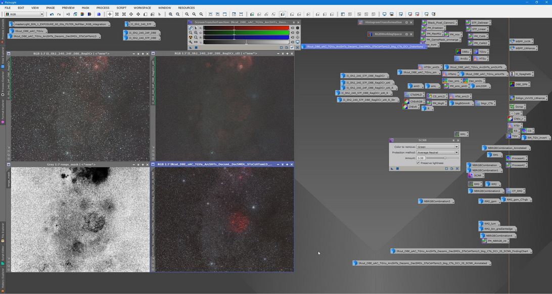 Am 1.1.2022 machte ich ein Experiment mit meinem "Dual narrowband" Filter: Dem Optolong L-eNhance 2019 hatte ich ja schon mal unter "Blog's" über Schmalbandfotografie ausführlich geschrieben Das L-eNhance ersetzte die damals beschrieben Kombination aus dem billigen visuellen UHC Filter und dem notwendigen UVIRCutfilter. Diese Spezialisierten Dual Narrow Bandfilter für die Fotografie, beschneiden ja dann auch den IR Bereich. Ich hab das L-eNhance mal im Fotometer ausgemessen: Die Kurven zeigen die Durchlässigkeit (Transmission) bei den jeweiligen Wellenlängen: Dunkelrot: Ist der L-eNhance Filter, der in dem Bereich öffnet wo der ionisierte Sauerstoff (500nm) und Wasserstoff (656nm) strahlt. Rot: Zeigt ein normales UVIRCut Filter, dass von 400-700nm öffnet. Der "normale" Filter, den man nimmt, wenn man eine modifizierte Kamera hat, die mit Klarglas Modifiziert wurde. Leider gibt es bislang für Olympuskameras keine passenden Filtermodifikation, die gleich ein UVIRCut Filter Glas verwenden. Das ist insofern schlecht, dass man hier für große Fotooptiken auch immer ein großes Filter finden muss, dass auch sehr gut ist und preislich noch im Rahmen bleibt, wie ich sie mit dem Haida UVIR750nm Filtern gefunden hatte. Preislich liegen die guten Schmalbandfilter in der 2" Größe über 200 Euro. Für große Fotolinsendurchmesser falls es sie gibt, also eher Unerschwinglich! Da wäre ein Clip In Filter vor dem Sensor das Mittel der Wahl, gibt es bislang nur von einem Hersteller (STC), aber die produzieren meiner Meinung nach zu viele Reflexionen bei hellen Sternen. Es besteht auch eine weiteres Problem der Interferenz filter vor einem Objektiv: Das Licht muss möglichst senkrecht durchfallen. Also ein 2" Filter vor einem 12mm gibt alles an möglichen Farbnuancen. Solche Filter gehören vor dem Sensor und natürlich auch ohne jegliche Verkippung. Ich experimentiere (halbherzig) mit einem Filterhalter aus dem 3D Drucker für 1,25" Filter. Die würden sich nämlich auch vor dem Filter ausgehen. Ungelöst aber: Verkippungsgefahr der Filter und wie bekommt man das mit dem Wechsel einfach hin. Auch das wäre eine Baustelle, die OM Systems einfach lösen könnte, wenn sie wollten. Egal! Für die Standard 2" Astrofilter habe ich mir schon zu Beginn einen Adapter von 52mm Gewinde von Objektiven, auf 2" Filter anfertigen lassen. Für die kleineren Linsenfilterdurchmessern habe ich step-up Ringe. Step-down für größere Linsen reduzieren die Öffnung und damit das Licht. Unsere Optiken sind auch ohne Aperturbremsen gut genug 😉 Mein verfügbares Objektiv mit der längsten Brennweite und das maximal einen 2" Filter erlaubt, ist das Olympus mFT45/1.8. Gerade bemerkt: Das 60er Macro würde auch gehen, ist aber lichtschwächer. Mir fällt spontan ein Objekt ein, dass groß genug für das 45mm Objektiv ist und gerade hoch über den Himmel zieht: Der Spaghetti Nebel (Simeis 147, SH2-240) im Sternbild Stier. Der Überrest einer Supernovae Explosion vor ca. 40.000 Jahren. Er ist 3000 Lichtjahre weit weg und mit einen Durchmesser von mittlerweile 140 Lichtjahren nimmt er 3 Grad am Himmel ein. Damit ist er also gut 6x so groß wie der Mond mit seinen 0,5 Grad am Himmel. Der Sternenrest selbst blieb als schnell drehender Neutronenstern, einem Pulsar zurück. Zum Inneren hin verblasst der Nebel immer mehr und mit den Überresten werden viele schwere Elemente in die Umgebung verteilt. Sie bildet den Grundstoff für Entstehung von Planeten und vielleicht auch Leben Ich packte also die Kamera auf den StarAdventurer und stellte alles möglichst weit hinten im Garten auf, um dem hellen weißen Licht der nachbarlichen Weihnachtsdekor zu entgehen. Mit dem Schmalbandfilter sieht man zunächst mal nichts auf dem Display. Die E-PL6 hat ja nur LiveView Ext. I. So schraubte ich zunächst den Filter ab und fokussierte mal. Danach am hellen Stern ß-Tauri (der obere Hornstern des Stier) dann ist darunter mein Objekt. Nach Aufschrauben des Filters fokussierte ich erneut am Stern, den man jetzt auf jeden Fall sieht. Was einem da jetzt sofort auffällt: entweder ist es der Rote Teil (h-alpha scharf), dann ist der Rest des Sternes groß und unscharf. Man sieht einfach, dass Linsen so gut sie auch gerechnet sind, nicht 100% farbrein sind. Bei s/w Kameras ist das auch kein Problem, weil jeden einzelnen Filter scharf gestellt wird und Spiegelteleskope sind von sich aus farbrein. Man hat hier im blau/grünen Bereich (O-III) ja 500nm und H-Alpha zu 100% bei 656nm zur Verfügung. Bei normalen Kameras beginnt der Filter vorm Chip bereits, ab 550nm zu sperren und sinkt weiter ab bis er bei 656nm nur noch 1/3 durchlässt. Daher sieht man hier die Farbtrennung der Optiken nicht so gut. Ein Abblenden würde es natürlich auch besser machen, aber das bedingt wesentlich längere Belichtungszeiten. Ich wollte mich auf 1 Minute beschränken, weil das bequem der interne Serienbildmodus erlaubt. Blende hatte ich auf F/2,5 und ISO auf 1600 gestellt. So werkelte die Kamera vor sich hin, als ich dann mal mit Licht kontrollierte stellte ich nach einer Stunde fest: Der Filter war in der Mitte zugetaut. Nachher bei genauer Kontrolle: Es hat bereits nach 24 Minuten begonnen. Man konnte es am immer heller werdenden Hof um ß-Tauri gut erkennen und dass im Zentrum immer mehr schwache Sterne verschwanden. Hier also ein Screenshot eines der Bilder mit den L-eNhance Filter (Bildvorschau in ACDSee und einmal mit automatischer Streckung und Farbkorrketur. OOC: Automatische Streckung+Weißabgleich Oben das Histogramm eingeblendet. Wie üblich: Die üblichen Automatiken der Kamera kommen mit dem vielen Rot nicht zurecht, dem Weißabgleich fehlt jede Menge Grün. Der versucht so gut es geht die Histogrammpuckel von Rot/Blau mit Grün zu vereinigen. Dafür kommen dann schon mal die starken H-alpha Emmissionsnebel heraus. S147 ist der große Bereich links unterhalb des hellen Stern rechts oberhalb der Bildmitte, ß Tau, oberhalb sieht man Teile des "Flaming Star