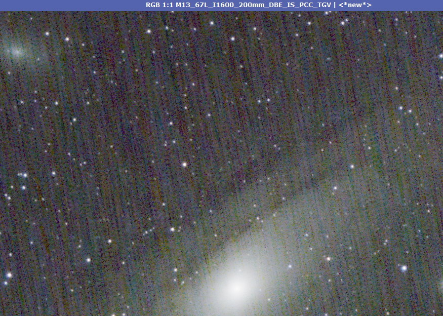 Außer bei sehr hellen Objekten wie die Sonnensystemkörper wo man notfalls ein bestimmtes Ereignis festhalten will, ist klarer und möglichst dunkler Himmel eine der wichtigsten Grundvoraussetzung. Zwischen den Schlechtwetterperioden Ende Mai bot sich eine kurze Gelegenheit um die ohnehin kurze astronomische Dunkelheit. Bei mir war das damals, 3 Wochen vor Tag/Nachtgleiche erst kurz nach 23:40. Der noch sehr helle Mond gesellt sich dann auch gegen 1:00 dazu, was hier sowieso zu einem Abbruch führen würde. Durch die feuchtere Luft und starke Abkühlung (Ende Mai bis auf 4 Grad morgens) konnte man schon ahnen, dass es wenn überhaupt nicht lange klar bleiben würde. Denn es bilden sich dann bald in größeren Höhen Dunstbänke oder gar Wolken, die den Himmel durch reflektiertes Licht der noch immer stark zunehmenden Lichtverschmutzung stärker aufhellen. Bei solchen Objekten wie Sternhaufen aber nicht so das Problem. Sterne sind ja recht hell. Ein Test mit dem Himmelsqualitätsmesser (SQM-L) hatte ich dann tatsächlich bald mal Werte um 20,70 später sogar gegen 21 gemessen, bis es dann merklich aufhellte gegen 01:10 durch Dunst und aufgehenden Mond. Rein visuell merkt man diese Verdoppelung der Helligkeit am Himmel kaum. Nur im Histogramm wandert der Peak (der Himmelshintergrund) leicht. Durch Dunst verbreitert sich dann irgendwann mal auch der Peak, weil das helle Sternenlicht zu Halos um die Sterne führt. Das kann natürlich auch eine beschlagene Linse sein, aber das war hier gerade nicht mehr das Problem, es war knapp davor und gerade noch klar für das Anfertigen der Flats. Egal aus den mehr als 2 Stunden konnten ich nach visuellem Aussortieren aller schlechten Bilder (durchziehende Wolkenbänke und diffuse Eintrübungen durch hohe Nebelbänke) 21 Bilder bekommen für die Bearbeitung. Damit kann man dann schon was anfangen und für diesen Zweck reicht es. Ich notiere mir immer wieder ein paar Eckdaten zu der Session: --------------------- Samstag immer wieder Wolken AZ-EQ6GT + E-M1.III mFT100-400 @400 F/6 2min ISO1600 24L 8D 58FD 34B 60F 23:25 8/82% SQM 20,70 23:45 8/84% SQM 20,70 00:15 7/86% SQM 20,90 00:40 7/88% SQM 20,68 Dunst! Abbruch Drüb hell !! Mond bereits aufgegangen F/D/FD/B ISO200 +1eV -------------------------- Neben der Qualität des Nachthimmels gibt es einen zweiten unabdingbaren Punkt: Wir brauchen scharfe genügend lang belichtete Bilder. Scharfzustellen vor allem bei länger brennweitigen Objektiven geht u.a. mit einer Bahtinov Maske, aber auch bei hoher Vergrößerung rein Visuell an einem helleren Stern recht gut. Die E-M1.III kann hier auch den Sternen AF Modus, der aber bei lichtschwachen Objektiven und langen Brennweiten auch bald mal versagt bezw. auch kein besseres Ergebnis bietet, als visuell die Größe des Sterns beim manuellen fokussieren zu beobachten. Das grundlegende Problem ist aber nun mal: Man muß oft minutenlang belichten. Das kann man mit wenig Aufwand und einem gutem Tracker bei kleinen Brennweiten (<70mm) noch hinbekommen. Noch dazu sind kleine Lichtstarke Brennweiten noch vergleichsweise günstig. Größere Brennweiten brauchen dann eine nochmals stark gesteigerte Nachführgenauigkeit und weil sie naturgemäß auch lichtschwächer sind zusätzlich noch längere Belichtungszeit. Da wird es mit den Freiheiten der Fotografie schnell sehr eng. Man liest ja oft, StarAdventurer (wohl einer der Besten günstigen) von bis zu 400mm kein Problem, aber man darf hier nicht vergessen: Wir haben FT Sensoren wo 400mm eine Vergrößerung eines 800mm an einem KB Sensor sind. Diese KB Sensoren haben noch dazu größere Pixel, die mehr verzeien. Also 200mm bei 4 Minuten an einem StarAdventurer würde ich schon als sportlich bezeichnen, wo sich einer wirklich mit der präzisen Einnordung gespielt hat und man das Glück hatte, dass gerade alles so läuft wie es sollte. Das tut es nämlich oft nicht, was man aber in der eigenen Praxis bald herausfindet. Dazu kommt aber auch: Auch wenn die Sterne rund aussehen mögen aber über längere Zeit sich das Bildfeld in eine Richtung verschiebt, kommt es dann zu einem sehr eunschönen, praktisch nicht zu korrierenden Effekt der "wandelnden Schatten" besser als walking shades oder moving noise. Dem kann man entgegensteueren indem man ab und an sein Bildfeld etwas versetzt. Nennt sich dithering. Da ich über eine sehr gute Montierung verfüge und ich zu einem Ergebnis kommen will, habe ich es hier leichter: Einfach das Ganze auf die große GoTo Montierung (SkyWatcher AZ-EQ6) und damit auch die Nachführung absolut präzise läuft mit Guiding. Mittlerweile brauche ich (wenn alles läuft wie es soll) unter 30 Minuten bis alles von alleine meine Belichtungen sammelt..... Der letzte wichtige Punk, den ich hier aber jetzt nicht bespreche: Die nachfolgende Bildbearbeitung. Da kann man auch mit noch soviel Geld keine Software kaufen, die einem das abnimmt. Da ist hart erarbeitetes eigenes Gewusst wie gefordert. Unsere Oly Kameras und verfügbaren guten Linsen sind hier jedenfalls die längste Zeit nicht der limitierende Faktor. Jetzt also zu dieser Session: Vorher habe ich mal bei MeteoBlue die Seeingprognose geschaut, wie die Bedingungen für meinen Raum vorhergesagt sind und beim lokalen Wetterdienst (INCA Karte) den Bewölkungsverlauf studiert um zu entscheiden probieren oder lieber schlafen 😉 Für alles andere wäre die Nacht sowieso zu kurz und schlecht, so entschied ich mich spontan für M13 mit dem 100-400 Zoom. Also das Ganze aufgebaut und mit der schnellen Kochab Methode eingenordet: Mit einem Auge durch das Polsucherfernrohr geschaut und mit dem anderen Auge die Position von Kochab (2. hellster Stern im Kasten des kleinen Wagen/Bären) und dann den Polarstern an die Position im Ring des Polarscope gebracht dass er auf einer Linie vom Zentrum aus zu Kochab steht. Das ist genau genug, dass ich bei 800mm zwischen 40 Sekunden und 1min 20 belichten könnte. Mehr Präzision erfordert dann einfach wesentlich mehr Zeit zum