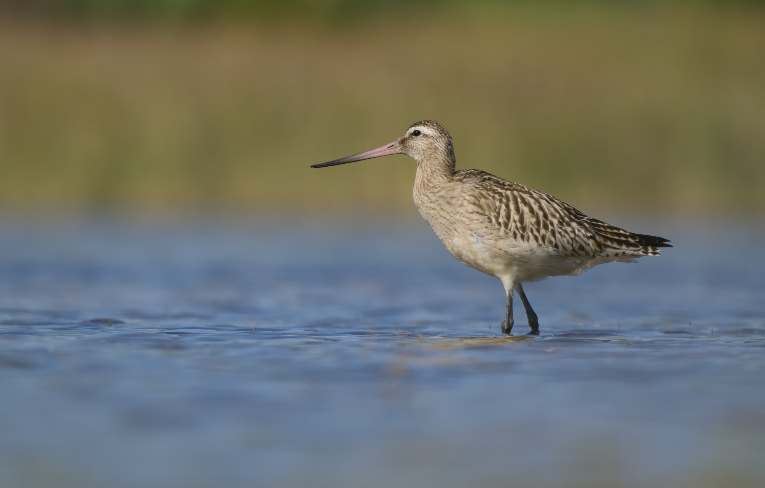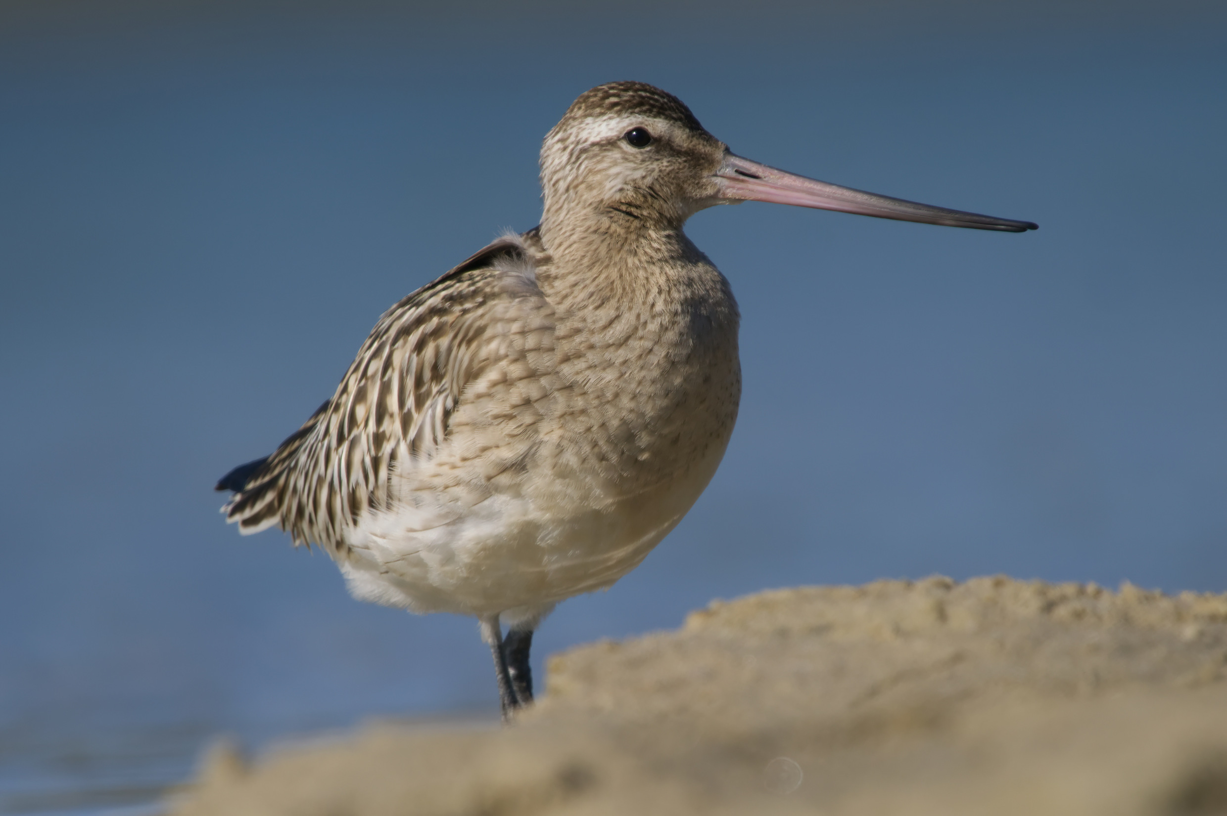 Eine Pfuhlschnepfe (diesjährig) derzeitig in Mitteldeutschland. Das Brutgebiet liegt jenseits des Polarkreises. Auf dem Zug nach Süden macht sie hier Rast, wobei das im Binnenland sehr selten der Fall ist. Markannt ist u.a. ein etwas leicht aufgeworfener Schnabel.