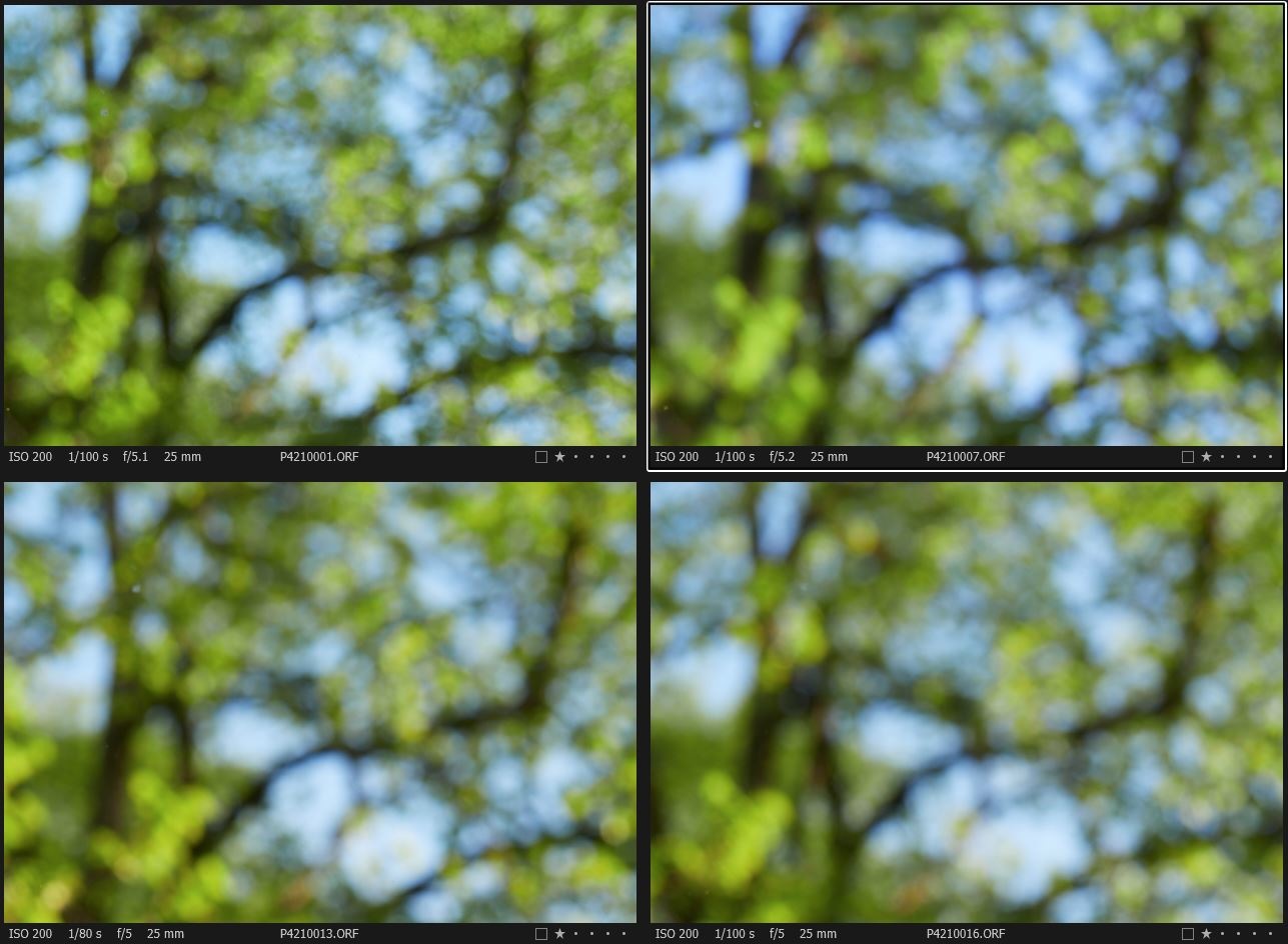 Da ich bei meinem neu erworbenen Oly 12-50mm das Gefühl hatte, ein doch recht unruhiges Bokeh zu sehen, aber irgendwie nirgends im Netz Hinweise oder Vergleiche fand, schnell ein Schnappschuß mit vier anderen Objektiven.