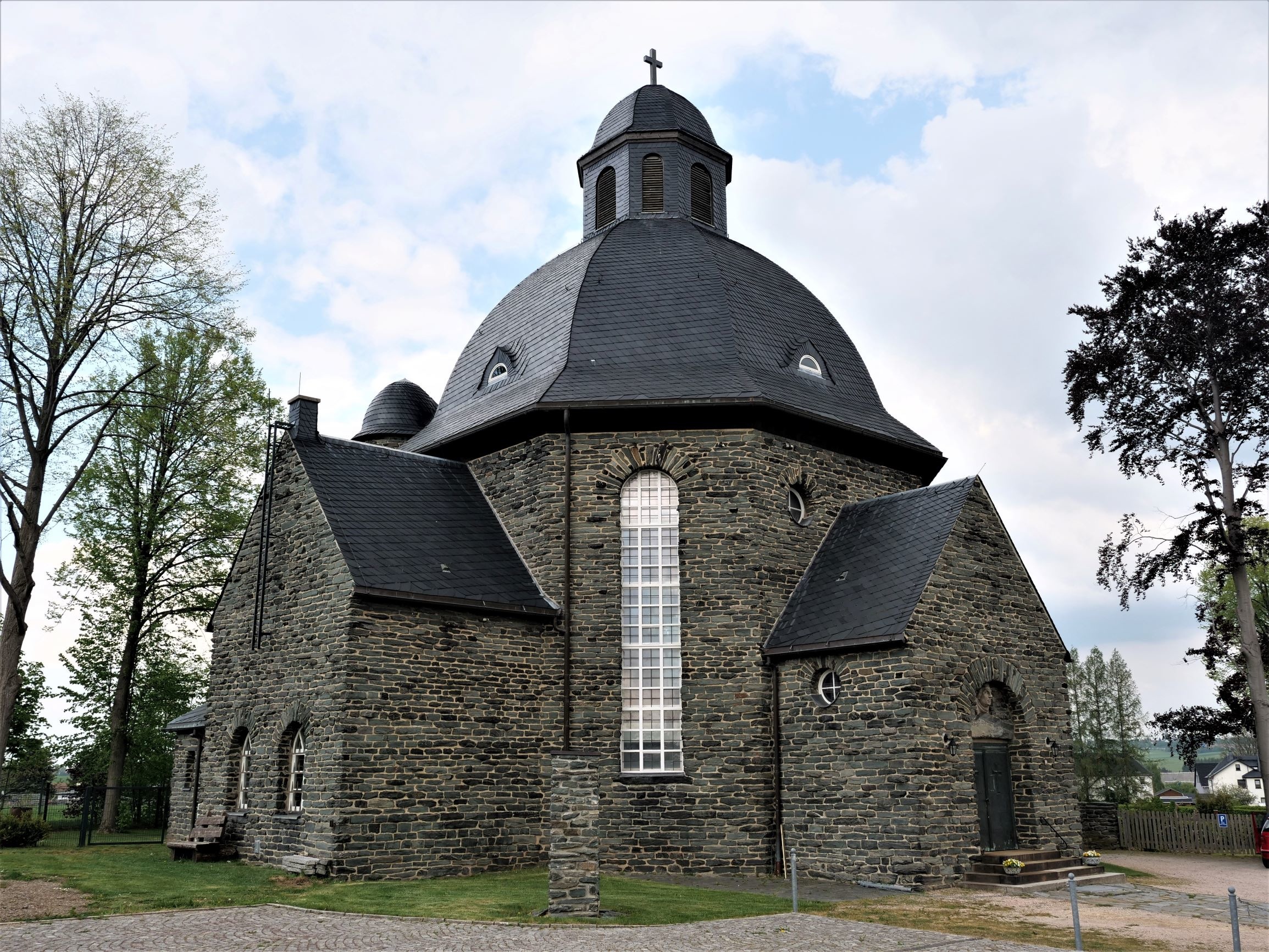 Architektonisch sehr gelungen - die Lutherkirche ich Neuwürschnitz; erbaut 1925, Natursteinmauerwerk aus Grünstein