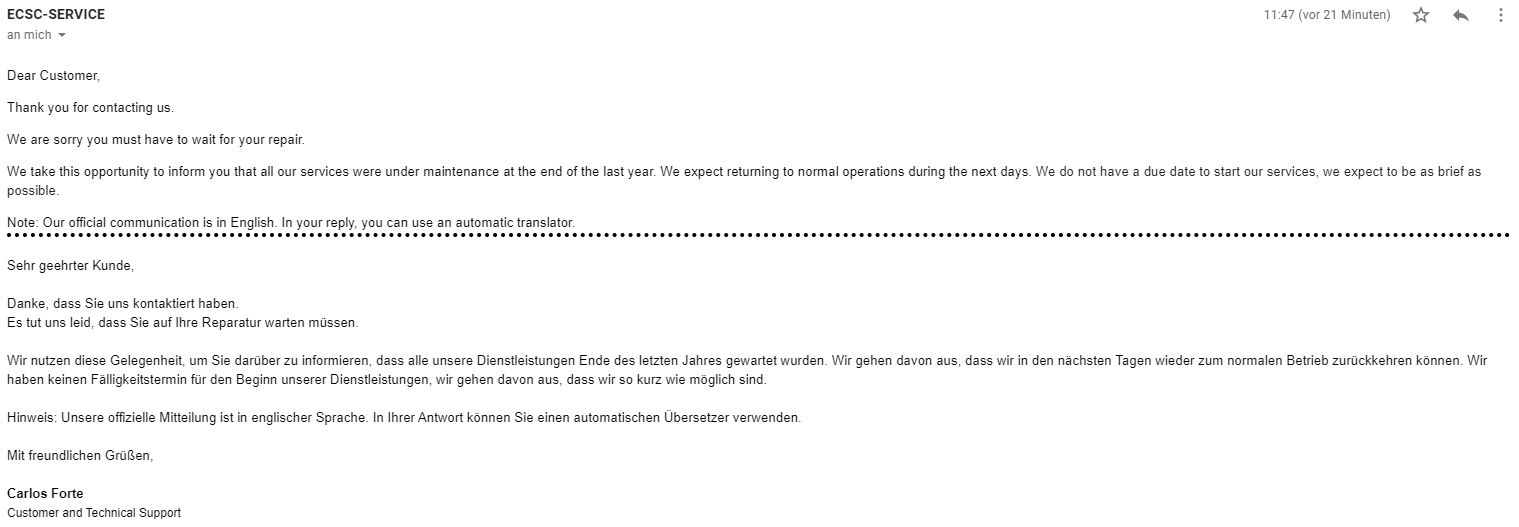 Also das nochmal so per Email geschrieben (dieses Mal gleich auf englisch, weil die Antwort in englisch und maschinell auf deutsch übersetzt kam) und wieder ein paar Tage warten...