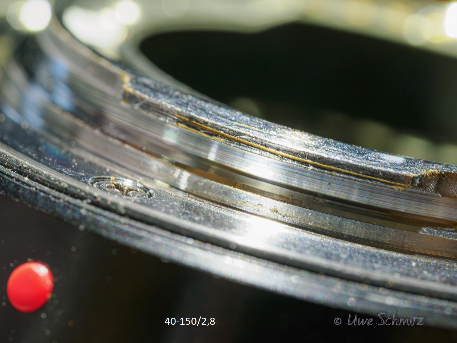Als Trost bleibt vorerst, dass Kratzer auf der sichtbaren Seite der Flügel für den Sitz des Objektivs irrelevant sind. Interesanter wäre, wie stark die Rückseite verschleißt. Das sieht man leider nicht gut.